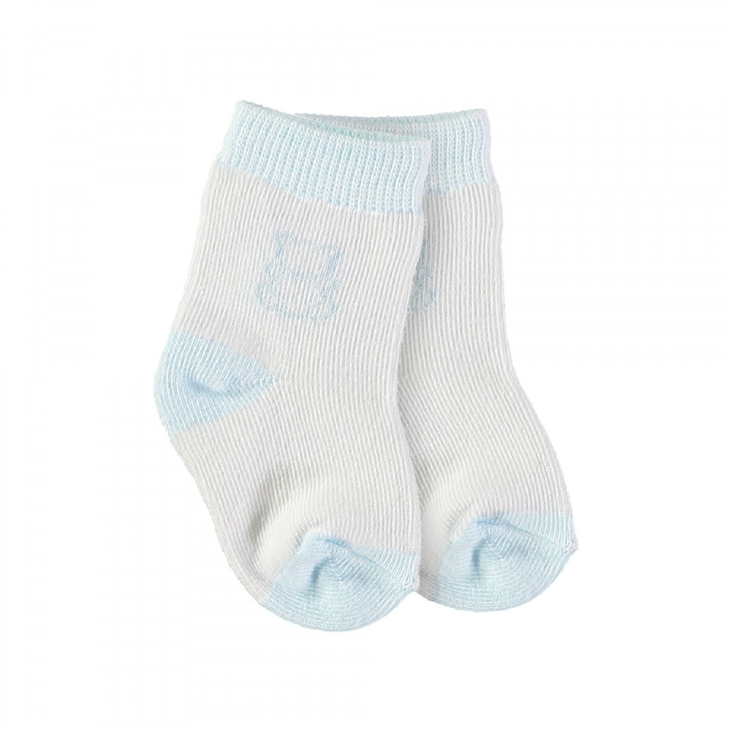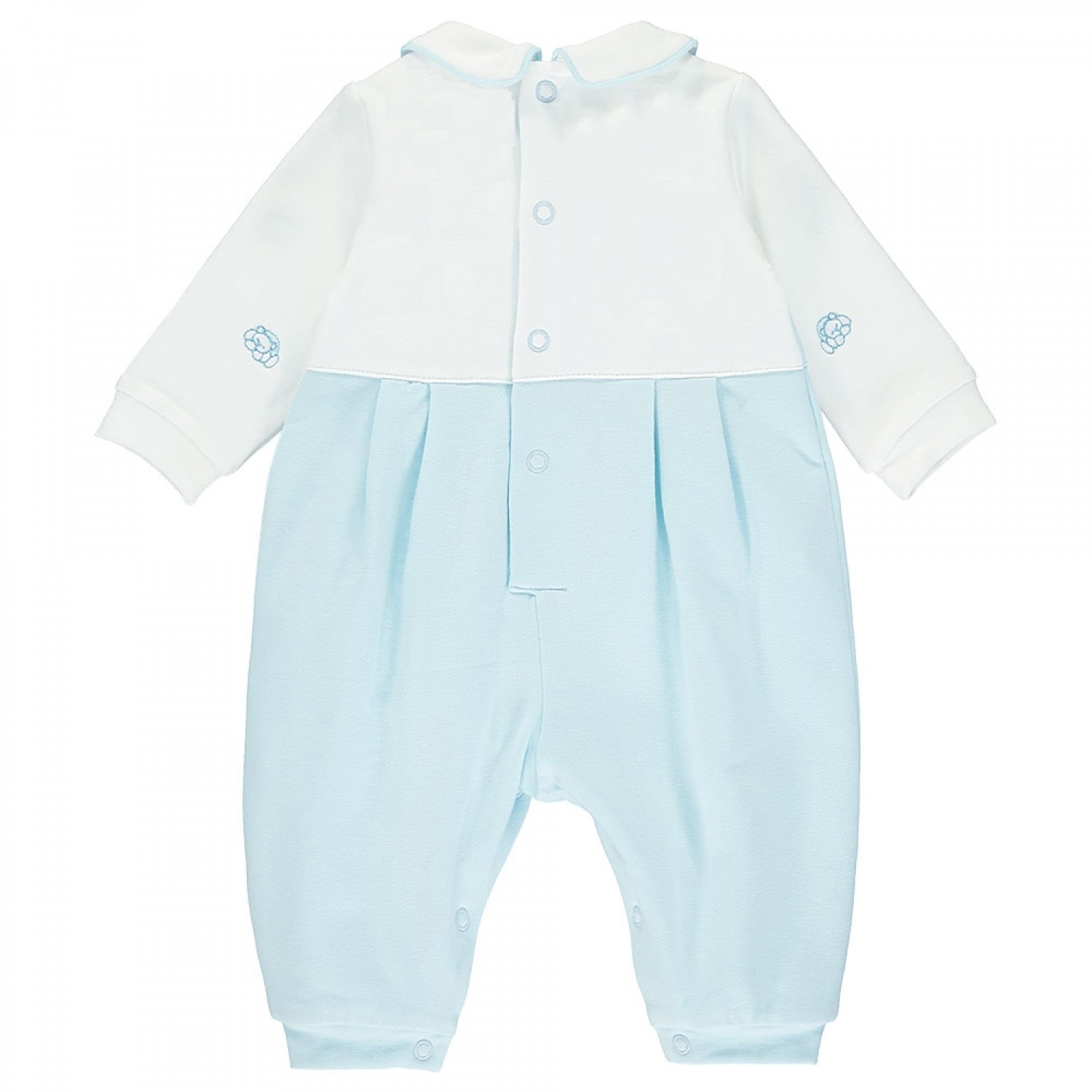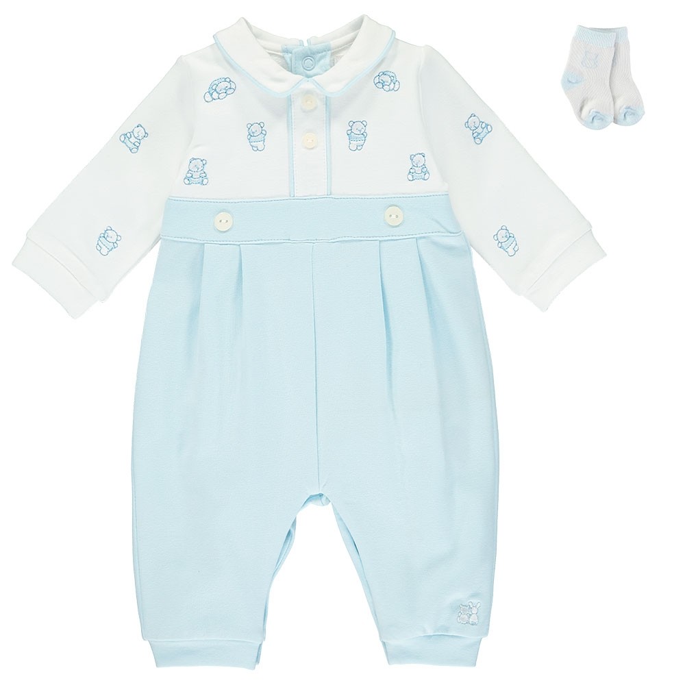 his is a great all in one for a new baby boy with sweet pale blue teddy bear embroideries. Two pearlised buttons either side of the garment add a touch of refinement. Complementary socks keep baby's toes toastie.