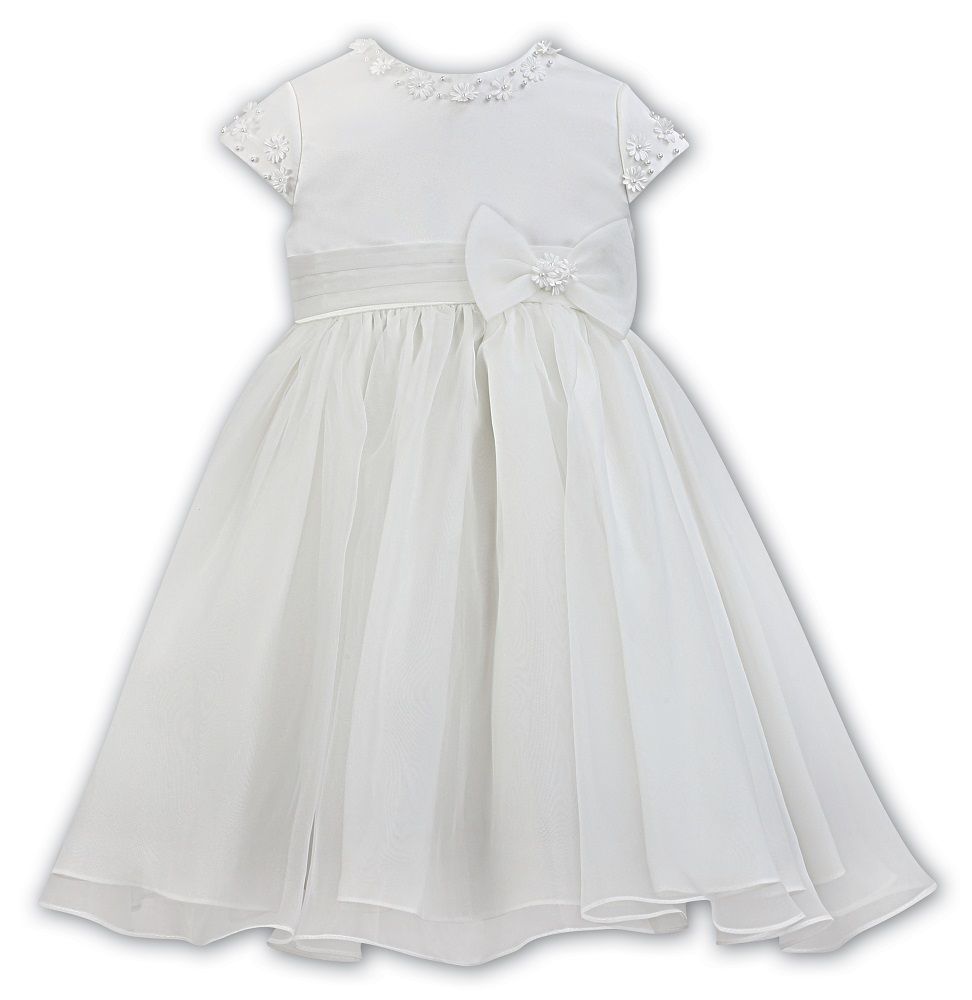 Ballerina length dress with a floaty skirt delecate flowers with pearls around the neck, sleeves and accent the bow on the waist band.