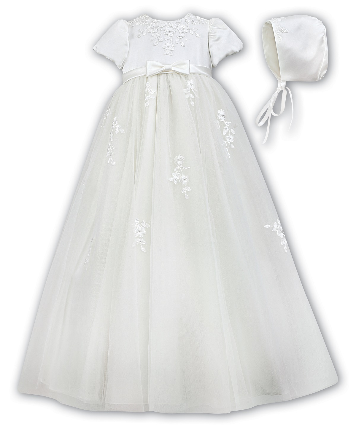 Long tulle gown with 3d lace embelishement around the neckline and on the skirt