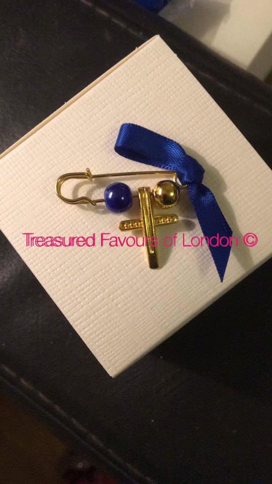 Gold colour pin and cross with royal blue and gold beads and royal ribbon. Other colour options available