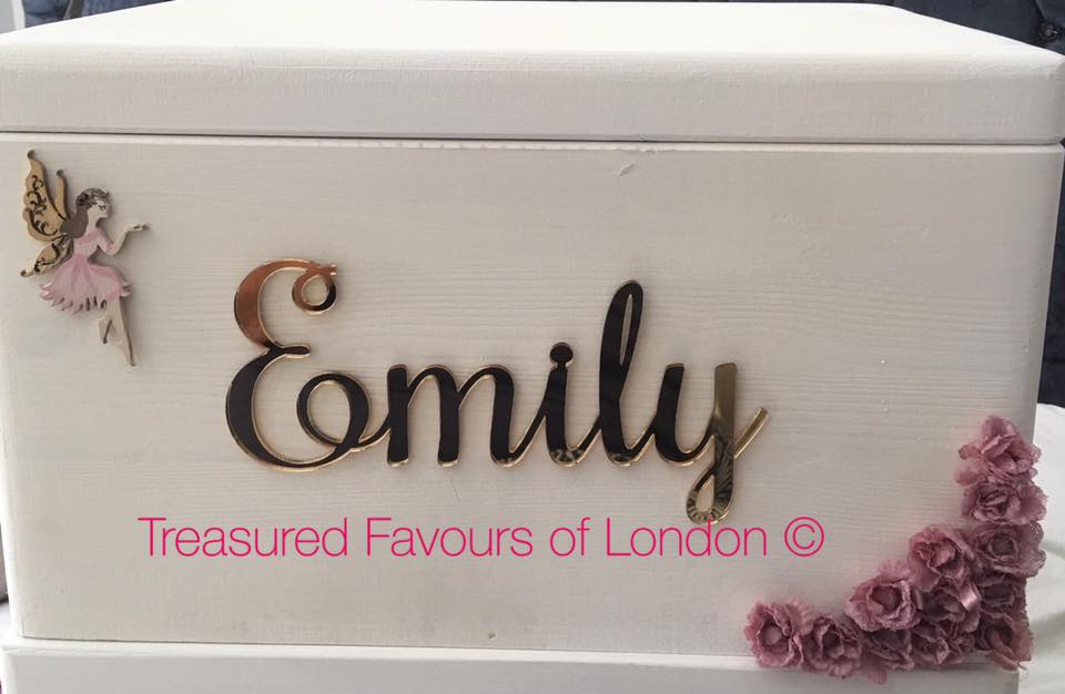 Wooden Christening box with gold mirror acrylic name,3d hessian flowers and wooden fairy.